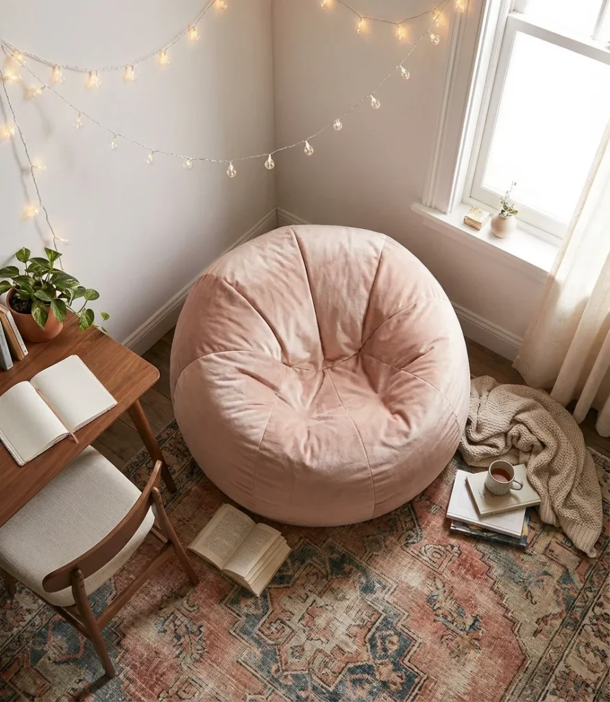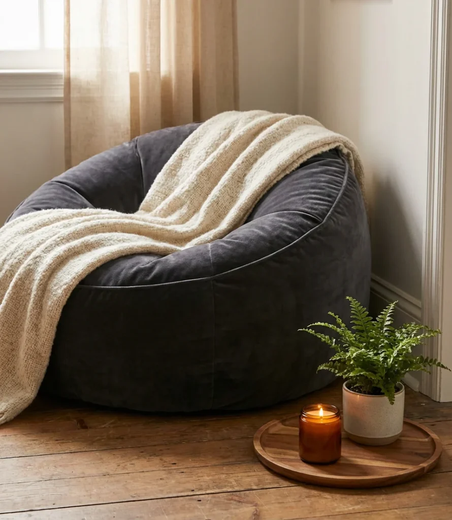 A reader who set up exactly this kind of corner in her Chicago apartment mentioned that moving from a traditional accent chair to a large beanbag transformed the space from “a chair I sat in occasionally” to “a corner I genuinely look forward to every evening.” The organic form makes it feel less structured and more personal—like the room is shaped around you rather than the other way around. For reading specifically, look for a beanbag with back support built in, or choose a “lounger” style that keeps your spine at a gentle recline rather than a fully flat position that strains your neck over long sessions.