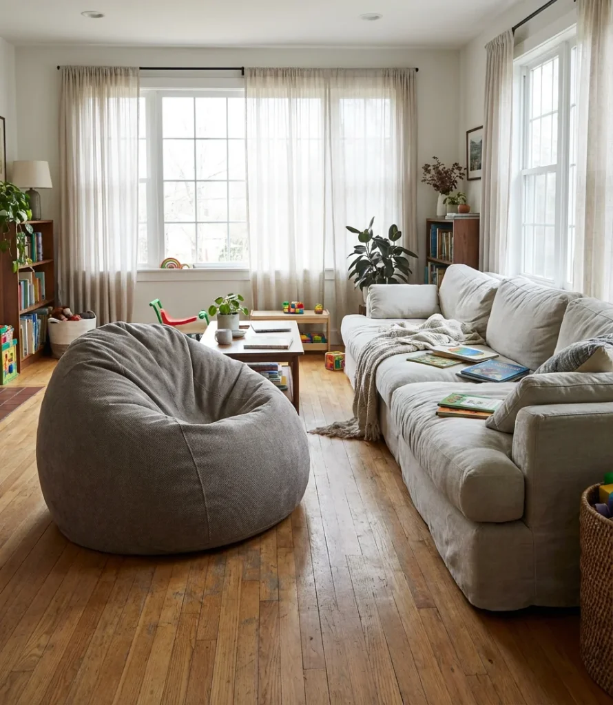 Storage is the real challenge with a piece this size. Many families in smaller homes—particularly those in urban apartments in cities like Chicago or Seattle—push it against a wall when not in active use and drape a throw over it so it reads as a design choice rather than a leftover. If you fill yours with shredded memory foam rather than traditional EPS beads, it holds its shape significantly better over time and doesn’t deflate into an unsatisfying pancake after a few months of use. Budget around $150–$350 for a quality oversized option with a washable cover.