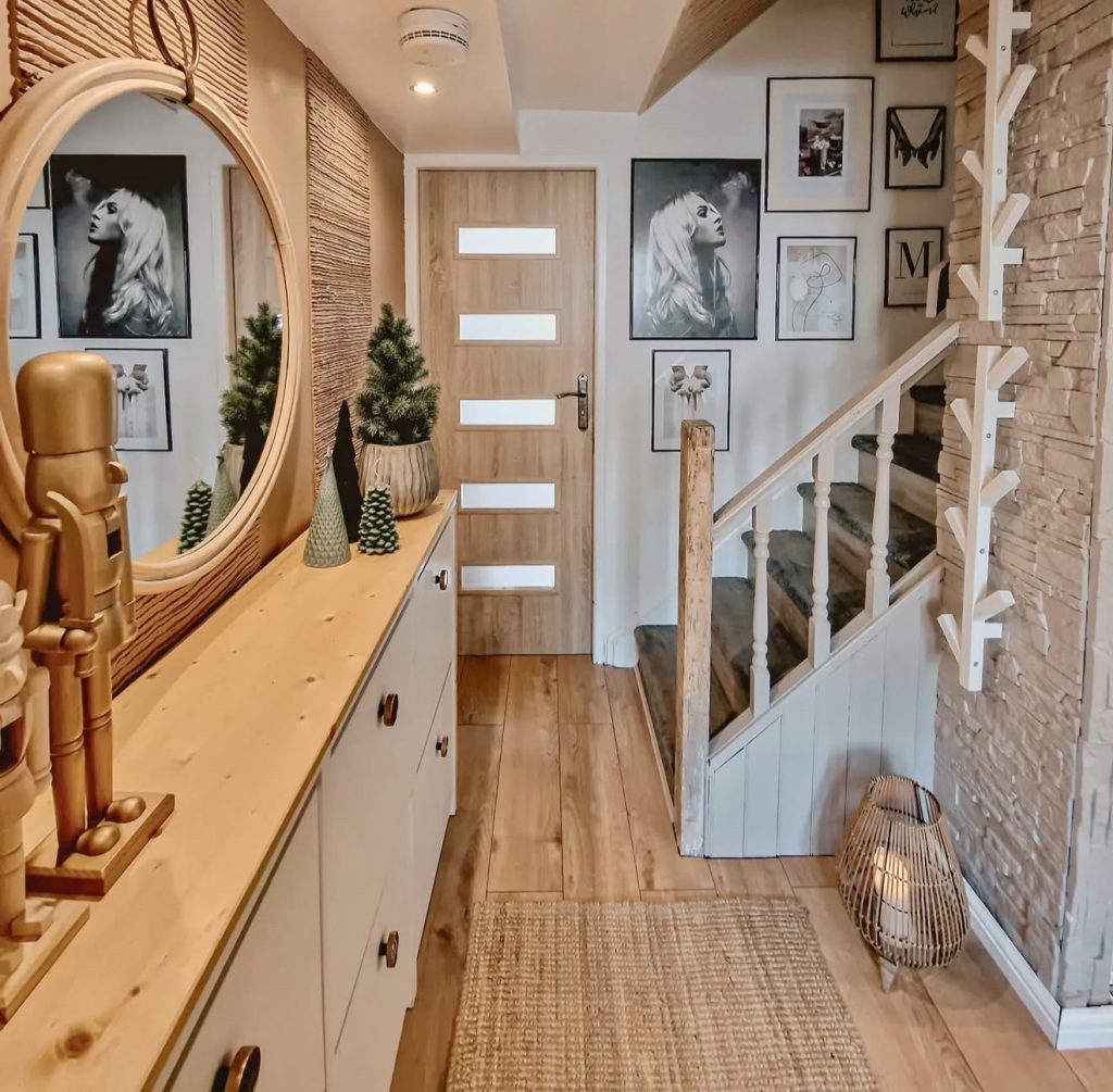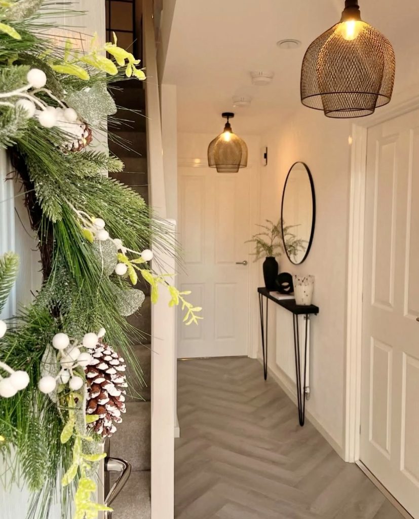 This elegant entry combines subtle Scandinavian tones with festive energy, proving that seasonal décor doesn’t have to overpower a space. The Christmas greenery wreath at the door brings a cheerful touch, while warm amber lighting casts a soft glow down the long narrow corridor. A sleek console with a round mirror adds balance—practical for checking your look before heading upstairs, yet minimal enough to keep things uncluttered. The herringbone flooring subtly elongates the narrow layout, creating a welcoming transition from outdoors to in.