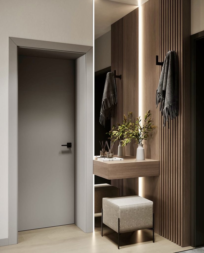 This space showcases the rise of natural textures in hallway decorating in 2026. Earth-toned walls, soft lighting, and curved shapes create an inviting atmosphere. The combination of oak furniture and a sculptural mirror introduces balance—simplicity without sterility. Perfect for narrow entries or small apartments, this design radiates calm energy, ideal for winding down after busy school days or welcoming guests to a serene home.