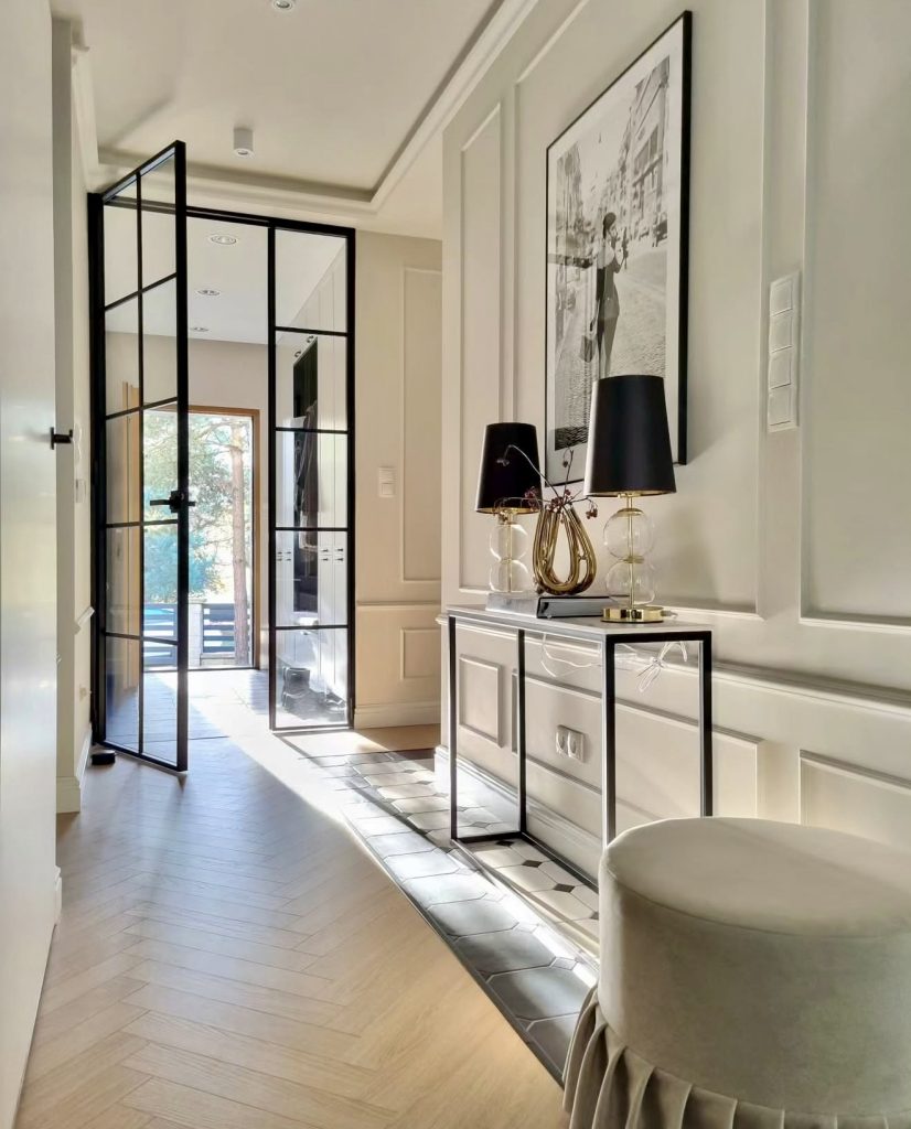For those who lean toward bold sophistication, this entry combines black-and-white contrast with modern sparkle. The crystal chandelier and geometric décor make the space feel both luxurious and grounded. Graphic art and sleek furniture lend a modern edge, while the symmetry keeps the composition elegant. It’s an inspiring example of how even a compact hallway can exude luxury when done with confidence—perfect for apartment dwellers who crave chic impact without clutter.