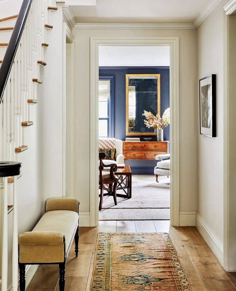 This hallway embodies the kind of warmth only a lived-in home can have. The vintage rug, wooden tones, and bench seating create a layered and inviting entry that feels both collected and contemporary. A glimpse into the adjoining bedroom and living space adds to the sense of continuity, making it ideal for families who want comfort without sacrificing sophistication. The gentle play of colors—deep blues, honey woods, and gold—adds depth, while the stair design keeps everything grounded in traditional charm.