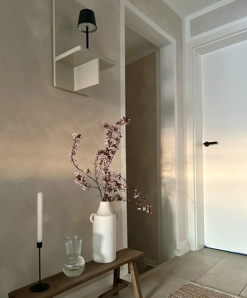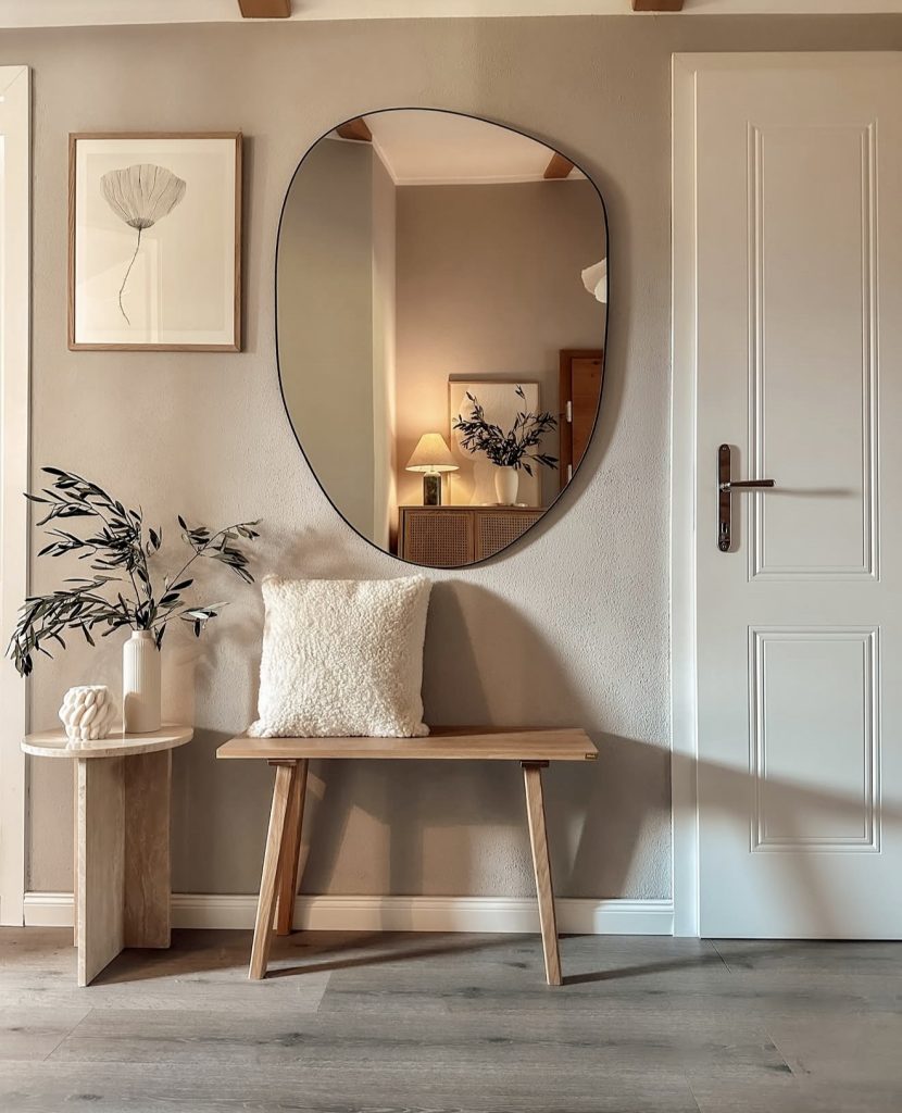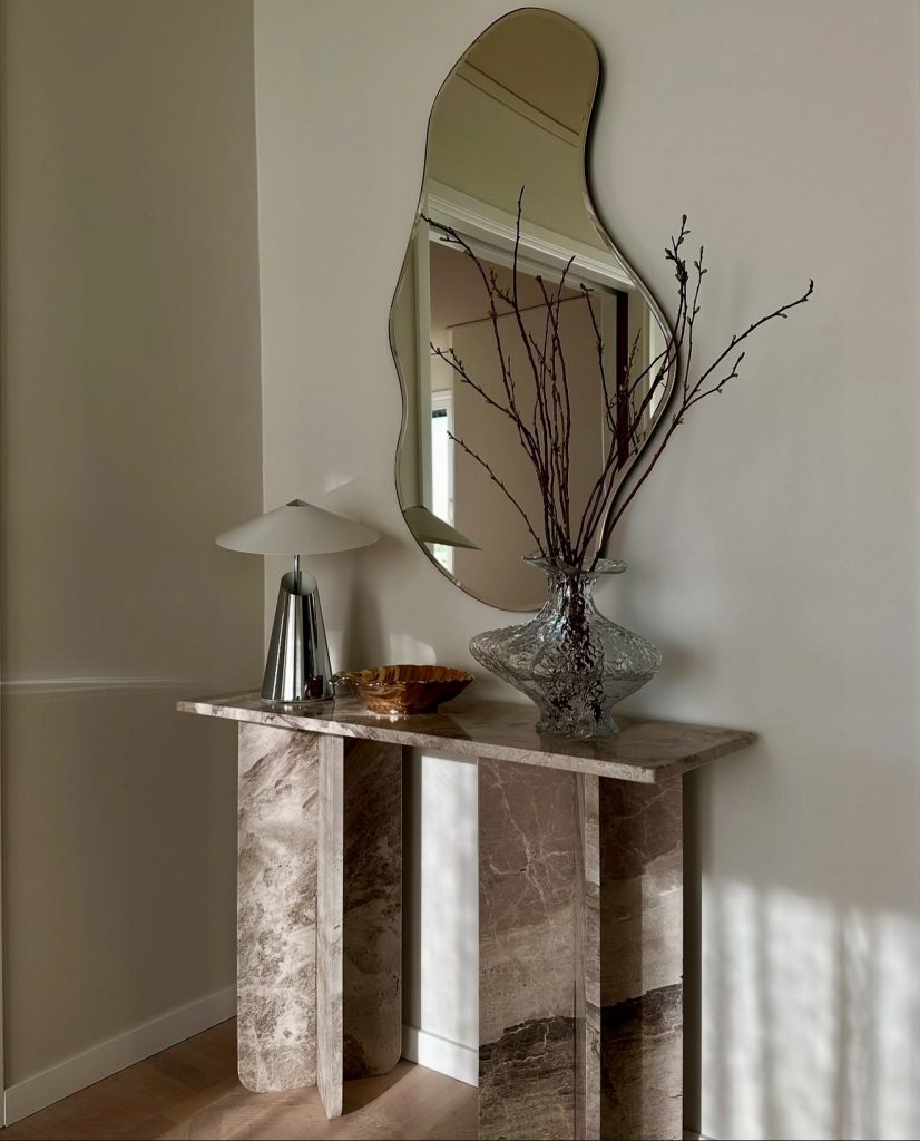 When design meets art, the result looks like this. The sculptural marble console and irregular mirror turn a simple corner into a statement of modern refinement. Every object—from the branch-filled vase to the metallic lamp—contributes to a sense of quiet luxury. This is minimalism for 2026: less about austerity and more about thoughtful curation. It’s a space that feels serene but never empty, a home where calm meets creativity. Perfect for those who crave a gallery-like entry with a personal edge.