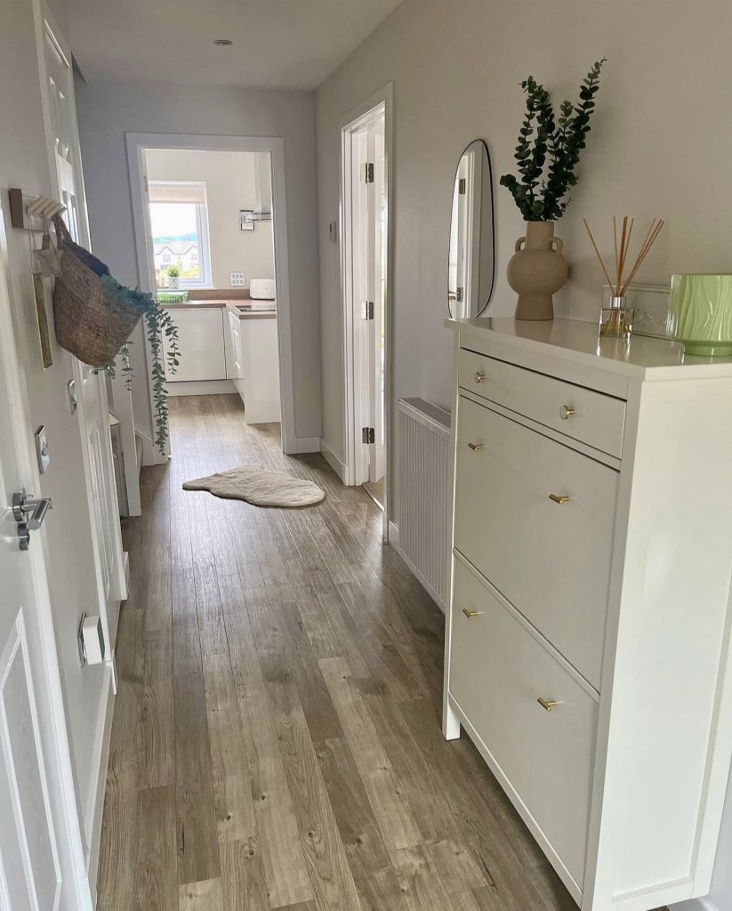 This home brings warmth and friendliness to the minimalist era. Pale wood flooring, neutral walls, and black details form a timeless base, while the stair and entry are softened with cozy accents—hanging plants, hats, and a round mirror with “hello” lettering. It’s the perfect example of modern small guest-friendly design: stylish, affordable, and endlessly adaptable. Whether you’re preparing for the Christmas school season or adding touches of Halloween fun, this hallway feels personal yet polished.