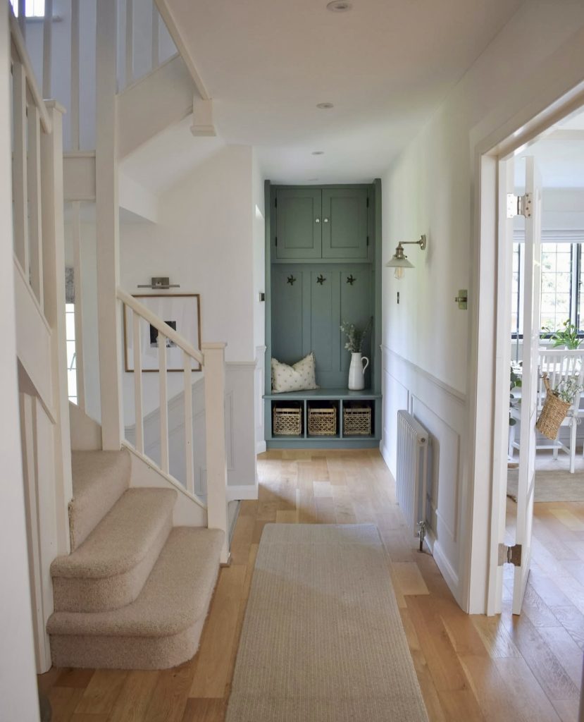 This bright and breezy home hallway feels like a breath of fresh air. Light-colored walls and woody plank tiles create a sense of decluttering and spaciousness. The built-in sage green nook breaks the monotony and adds a touch of warmth. The combination and contrast of colors and tones have a coastal feel to them, a perfect style for coastal homes or suburban family houses. Candice and the baskets create warmth and a sense of comfort together with soft textiles. The design of the stairs adds to the clever use of an otherwise small design footprint. The space is beautifully neutral and provides a timeless welcome. The design embraces functionality with its warm and cozy embrace.