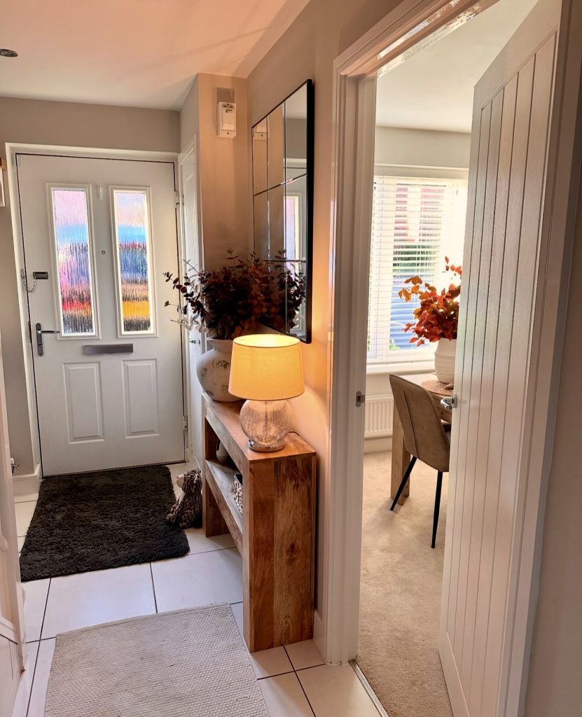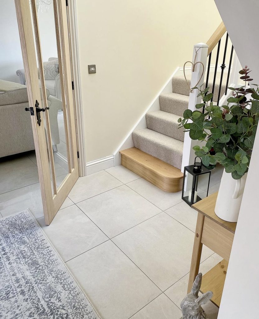 This entry blends comfort with crisp modern design. Pale flooring and a carpeted stair make the space feel cohesive, while the glass door floods the area with light. A few natural accents—a lantern, leafy greenery, and a soft rug—add instant warmth. It’s a home that says “welcome” without words, perfect for both everyday living and seasonal styling, whether it’s Christmas greenery or Halloween pumpkins. Subtle yet inviting, this hallway captures how small changes can make a big difference in creating atmosphere.