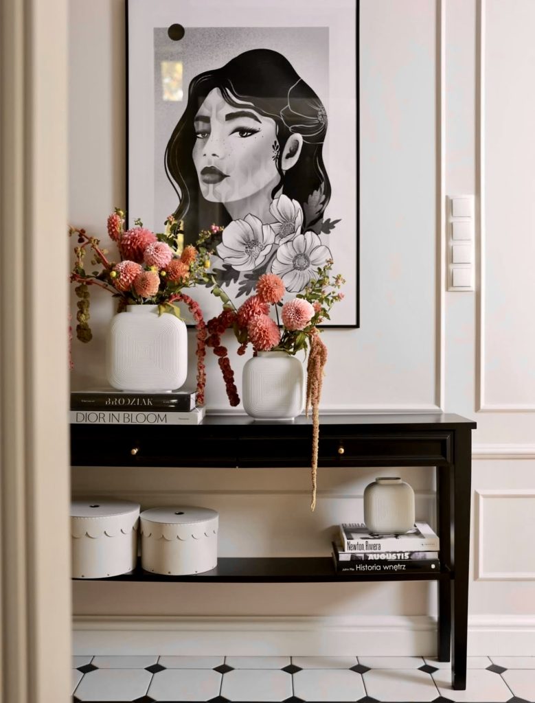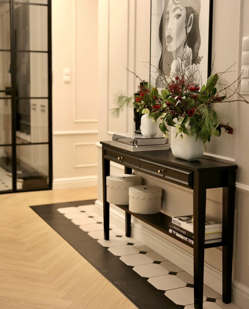 Every home deserves a hint of drama, and this hallway nails it. The bold artwork and monochrome floral arrangements feel gallery-ready, making the space ideal for design lovers who see their entry as an extension of personal style. The black console with golden knobs contrasts beautifully with soft ivory walls and patterned tiles—a nod to timeless Parisian chic. The play of colors here, between creamy neutrals and rich accents, feels sophisticated yet inviting. It’s the kind of design that inspires confidence every time you walk through the door.
