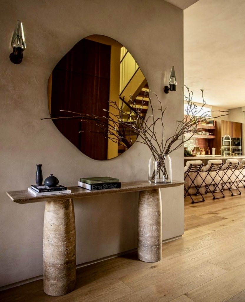 This hallway brings natural materials to the forefront, showing how simplicity can feel truly luxurious. The sculpted travertine console, curved mirror, and delicate branches form a harmonious composition that radiates calm. The design feels inspired by the earthy tones of the sea cliffs—minimal, organic, and deeply grounding. It’s the kind of home space that encourages you to slow down for a second, take a breath, and appreciate the quiet beauty around you. Ideal for open-plan houses and large entries that crave subtle sophistication.