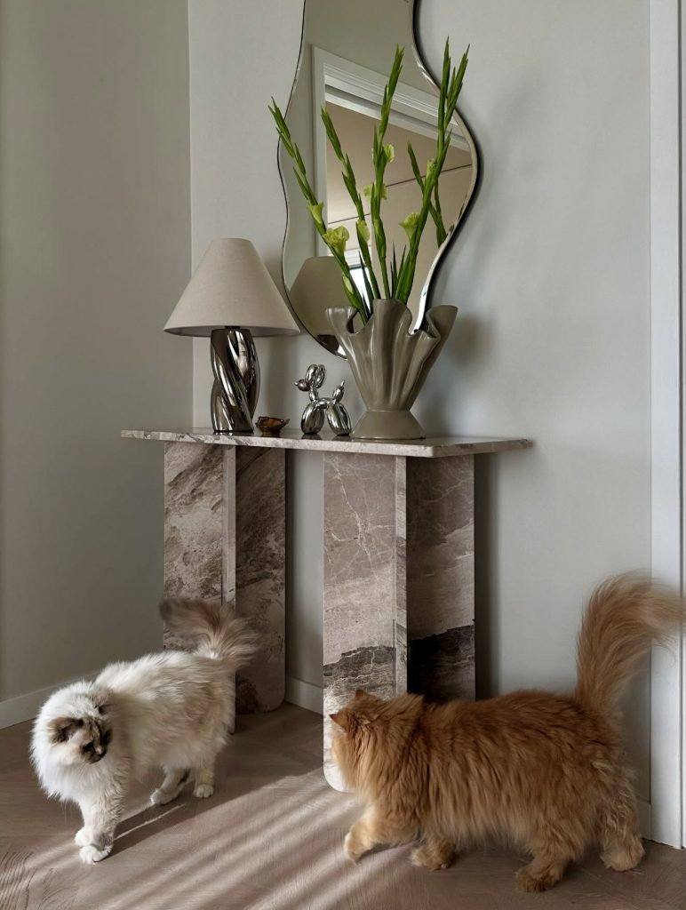 This hallway strikes the perfect balance between high design and personality. The sculptural marble console and fluid mirror catch the eye instantly, while silver accessories and fresh green stems bring in a note of modern vitality. The two cats wandering through the scene add warmth and life—a reminder that even sophisticated spaces should feel lived-in. The look is ideal for a home where elegance meets authenticity, where clean lines coexist with a touch of whimsy.