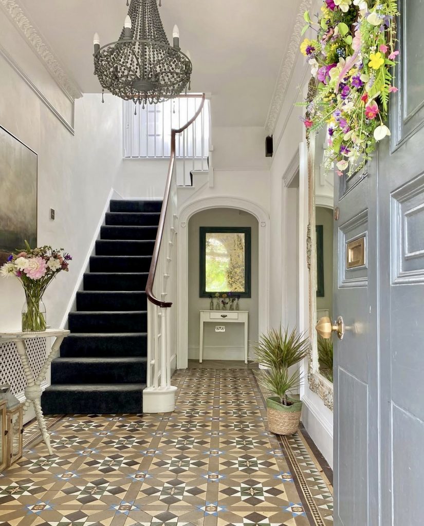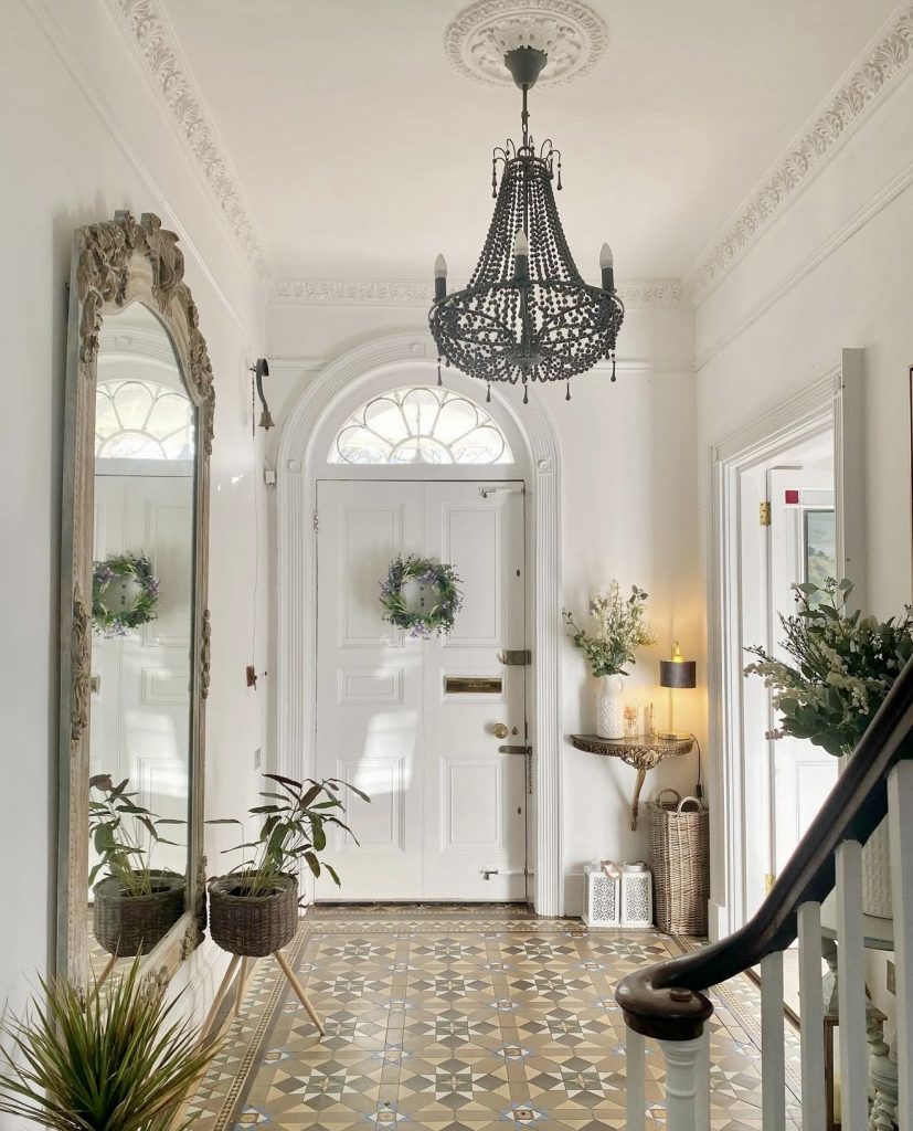For those who adore timeless design, this bright and airy entrance captures that enduring elegance perfectly. The ornate chandelier, arched door, and Victorian-style molding pair beautifully with patterned tiles underfoot—a stunning nod to history that feels right at home in 2026. Touches of greenery on the door add a subtle Christmas note, proving you can decorate seasonally without losing sophistication. The mix of colors—from ivory to antique gold—feels refined yet inviting, an ideal inspiration for anyone who wants to elevate a large hallway without overcomplicating it.