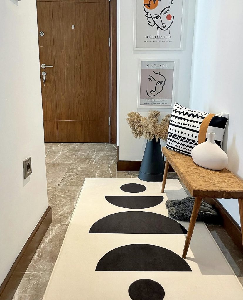 Perfect for city apartments or dorm living, this hallway proves that simplicity can make a big impact. The neutral marble flooring anchors the space, while a geometric rug introduces a modern edge without overwhelming the narrow footprint. Matisse prints on the wall and a woven bench bring warmth and personality, turning a compact entry into a curated design statement. The mix of wood, black, and soft cream keeps the aesthetic balanced—a subtle nod to mid-century influences with a modern twist.