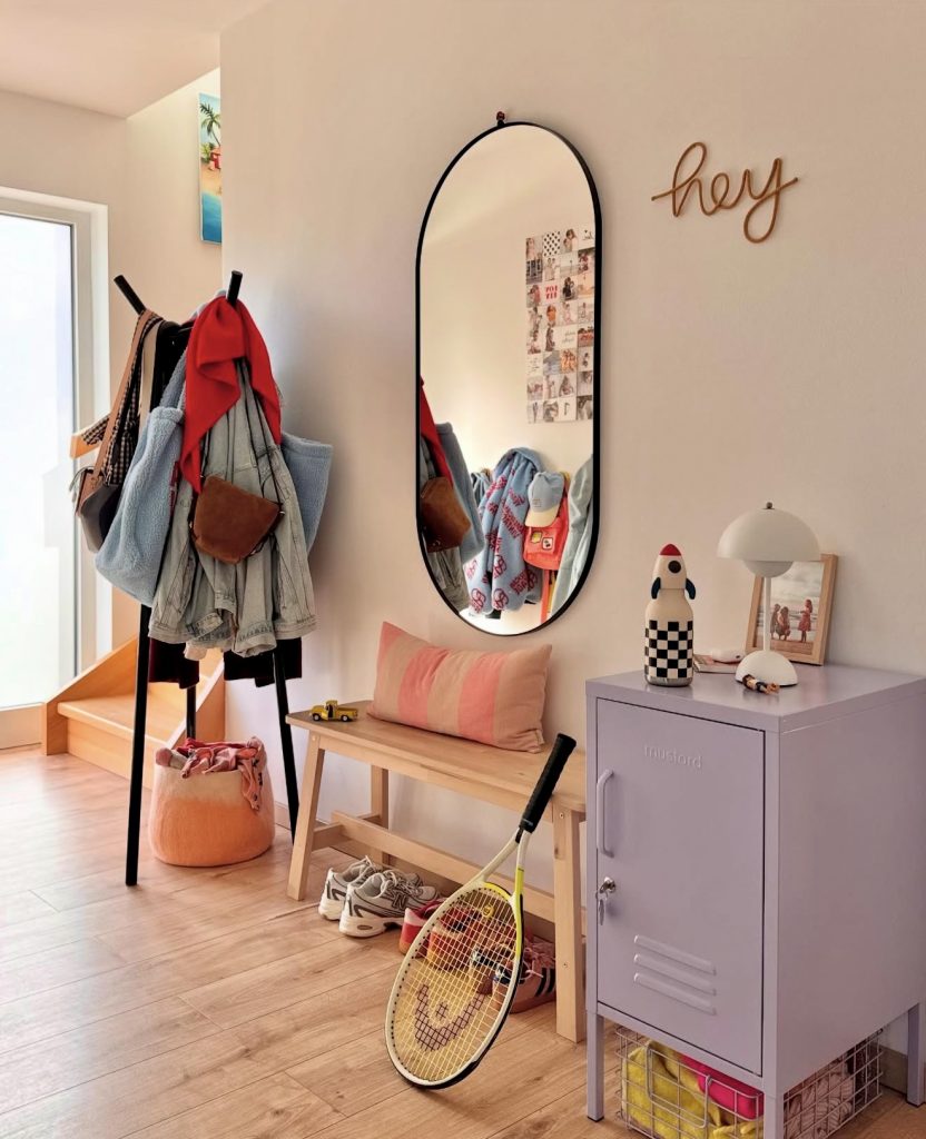 This cheerful hallway proves that function and fun can coexist beautifully. Bright natural light, a soft wooden bench, and pops of pastel color make the space feel lively yet organized. The lilac cabinet and curved mirror add personality, while the “hey” wall art offers a playful welcome. Perfect for family homes, this look brings energy to everyday life—ideal for a school morning rush or a cozy weekend in. It’s casual, modern, and full of personality—the perfect introduction to a happy home.