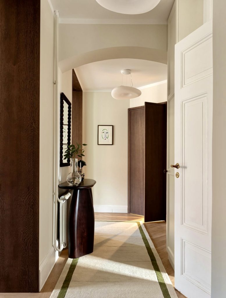If elegance had a shape, this would be it: a hallway with a timeless atmosphere. The polished symmetry of the console with twin lamps invites the eye to rest, as natural sunlight spills across the chevron floor and highlights the paneled walls. The subtle mix of materials feels upscale, yet accessible. It proves that a well-chosen artwork and good lighting can transform even a long corridor into a space worthy of an editorial spread. This is perfect for anyone turning a narrow entry into a statement.