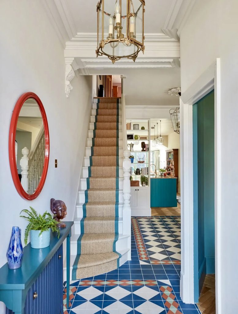 Smiling and joy-filled, large hallways can be a celebration of color. Not all spaces can be bold enough to try it. The color combination of blue-green wall panels, the design of the floor tiles, and the natural elements on the stair runner all seem to come from an editorial. The old chandelier and the large mirror capture all elements. There is a very large school building for creative purposes of the old family home, which can be reimagined as a residence and still captures the 2026 design spirit. The design is personal, bright, and most importantly, fearless.