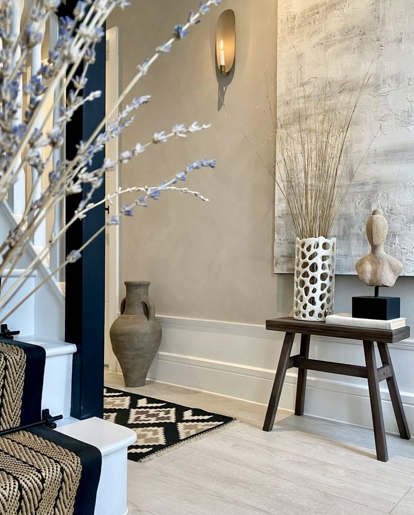 Earthy elegance defines this serene entry that blends modern minimalism with a handcrafted feel. The neutral palette of taupe and cream creates a grounding atmosphere, while dried lavender and ceramic vases bring soft organic texture. The woven stair runner anchors the space with warmth, echoing natural fibers that feel both rustic and refined. It’s a perfect look for anyone who wants their home to feel like a calm retreat by the sea, where every detail whispers quiet sophistication rather than shouting for attention.