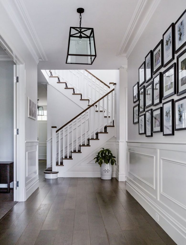Few things personalize a home like a wall of family photos. This design transforms a long corridor into a storytelling space, using symmetry and clean lines to highlight cherished memories. The crisp white stair railing and paneled wainscoting evoke a traditional American style that never goes out of fashion. Despite its length, the layout avoids feeling too formal thanks to soft lighting and greenery. This could easily be the entry of a busy family house or even a dorm-turned-residence where nostalgia meets elegant design.