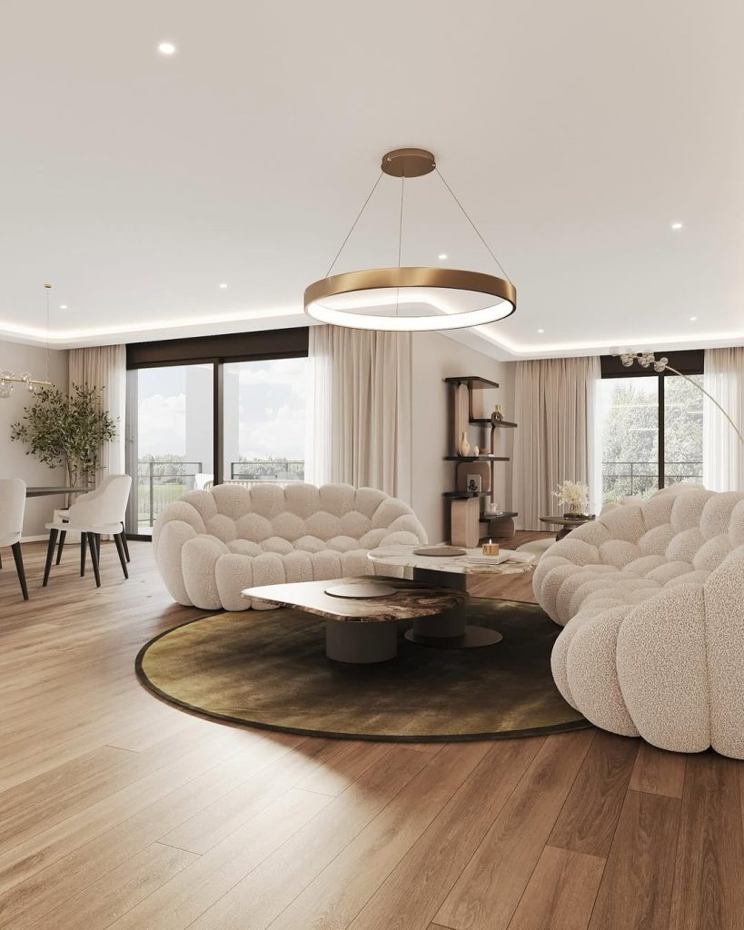 This spacious room is defined by plush rounded seating that makes a bold design statement. The curved forms create an inviting softness, adding a cozy feel despite the scale. Paired with a circular rug and sleek chandelier, the space feels both modern and luxurious and elegant. Expansive windows flood the room with light, reinforcing the airy openness that aligns with 2026 trends. It’s a space where contemporary luxury thrives, ideal for those who love striking forms paired with everyday comfort.