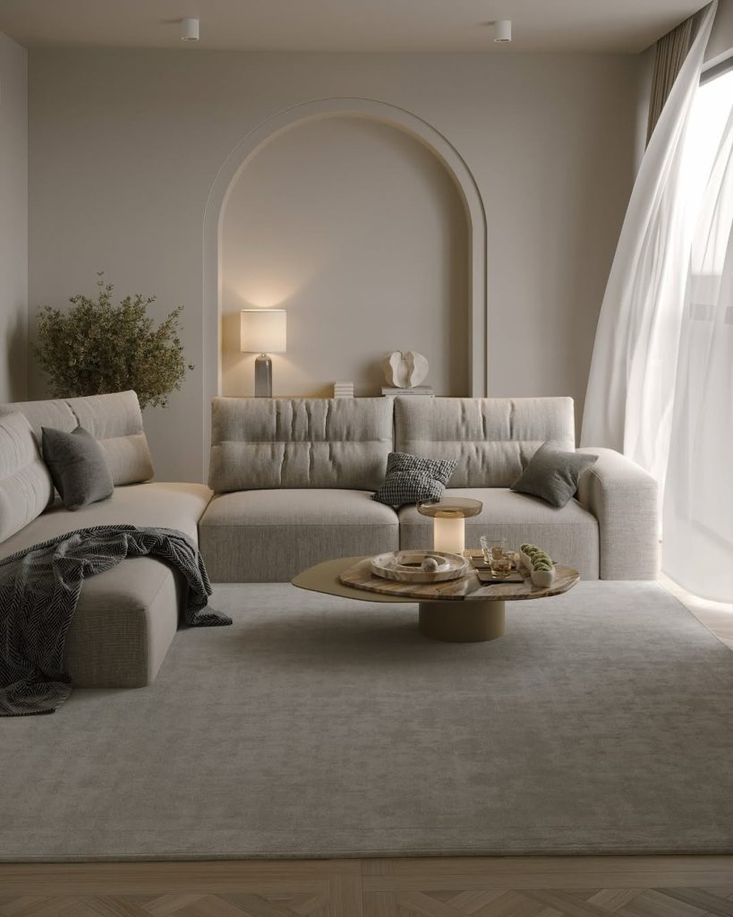 In 2026, modern luxury is defined by softness—tactile neutrals, sculptural lines, and a serene palette of beige and taupe. This minimalist living room blends calm functionality with architectural interest, seen in the recessed arched wall niche that subtly frames a lamp and art piece. The grey couch and curved coffee table introduce quiet opulence, echoing Japandi influences through clean silhouettes and warm and cozy textures. A soft rug grounds the space, inviting relaxation while maintaining contemporary luxury precision. Designers forecast this aesthetic dominating 2026 trends, especially for those who value elegant restraint and serenity in small spaces.