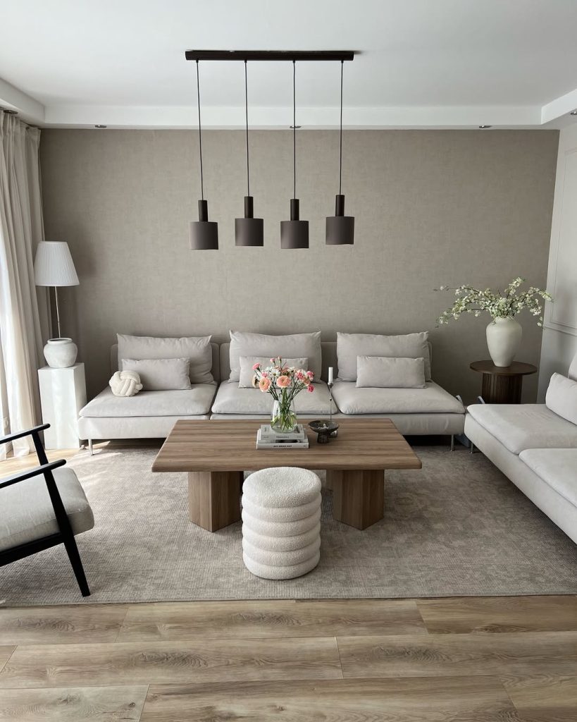 This living room embodies the Japandi approach, where minimalist Japanese influence meets Scandinavian calm. Soft neutral tones and a sculptural coffee table set the stage for understated modern luxury. Wall treatments with geometric patterns add depth, while low furniture keeps the space light and grounded. The overall design feels serene and uncluttered, perfect for creating a cozy environment without excess. It’s a space that speaks to inspiration seekers who crave harmony in their everyday living.