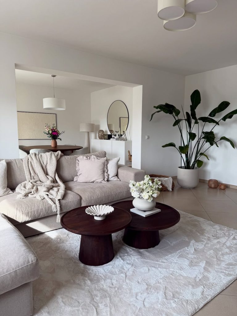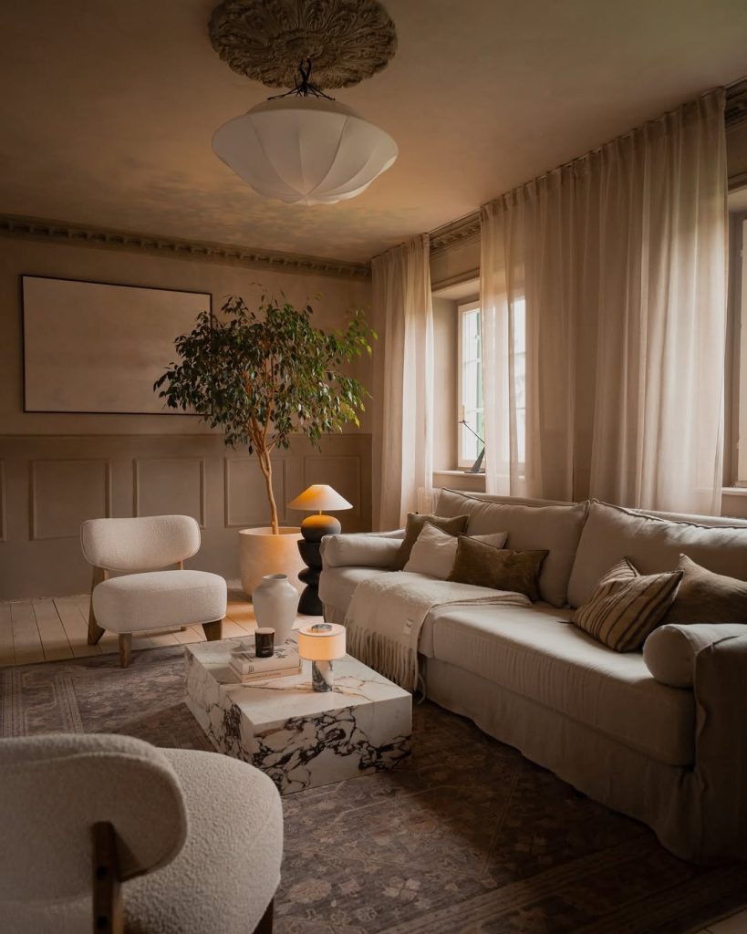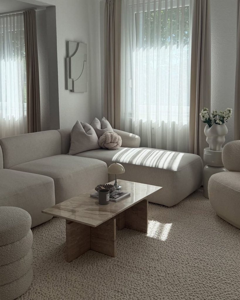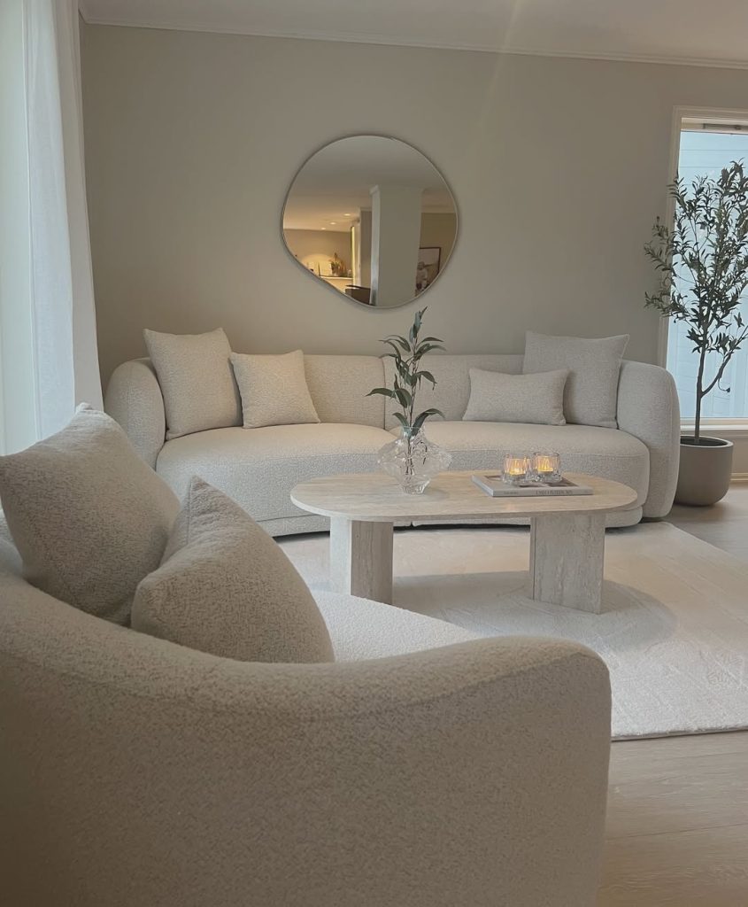 Rounded sofas and organic shapes dominate this Japandi-inspired sanctuary, showing how modern living embraces natural flow and imperfection. A circular mirror introduces fluid energy, while a pale color palette and tactile fabrics keep the setting elegant and soothing. The minimalist stone coffee table and delicate greenery add balance, making it ideal for contemporary luxury homes. This look feels especially relevant for 2026’s pursuit of mindful design—calming forms and warm tones that help transform small spaces into havens of restoration.