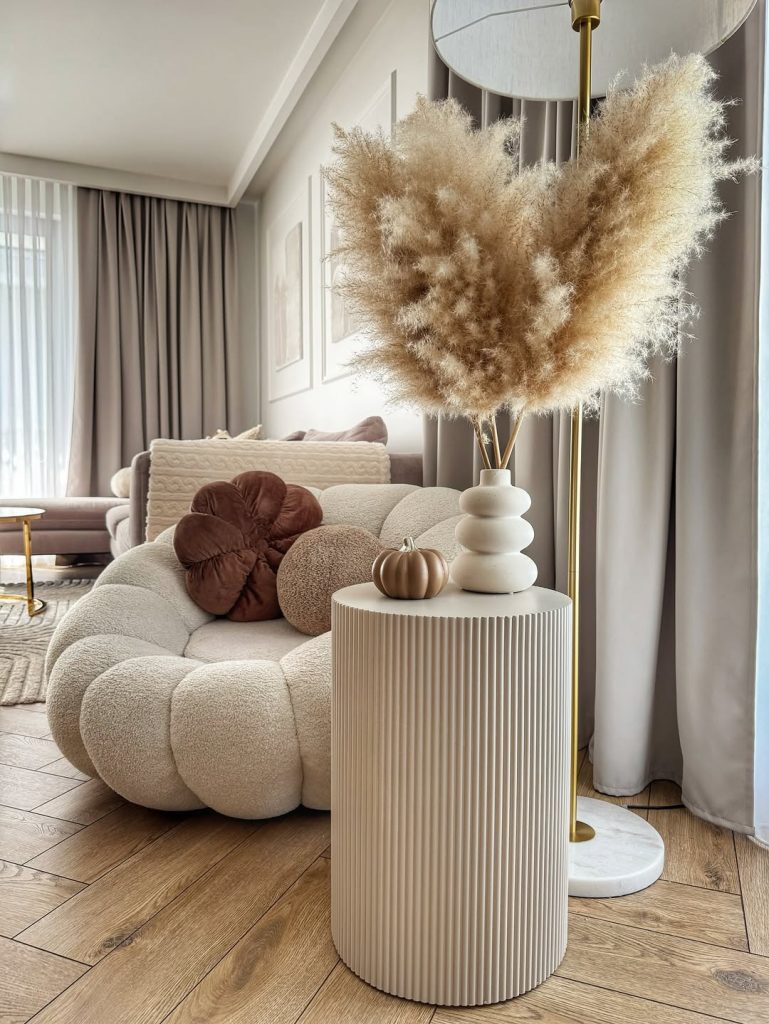 This modern living room embodies the light, airy spirit of minimalist design. The sculptural round armchair with sophisticated pampas grass adds personality without dominating the space. The gray color palette with touchable finishes highlights that 2026 luxury modern trends count on touchable textures and natural movement. Soft curves combined with layered texture create a cozy chic space that is a warm balance of shape and comfort. Influencers like Studio McGee highlight this look as a key inspiration for creating elevated yet approachable decor in American homes.