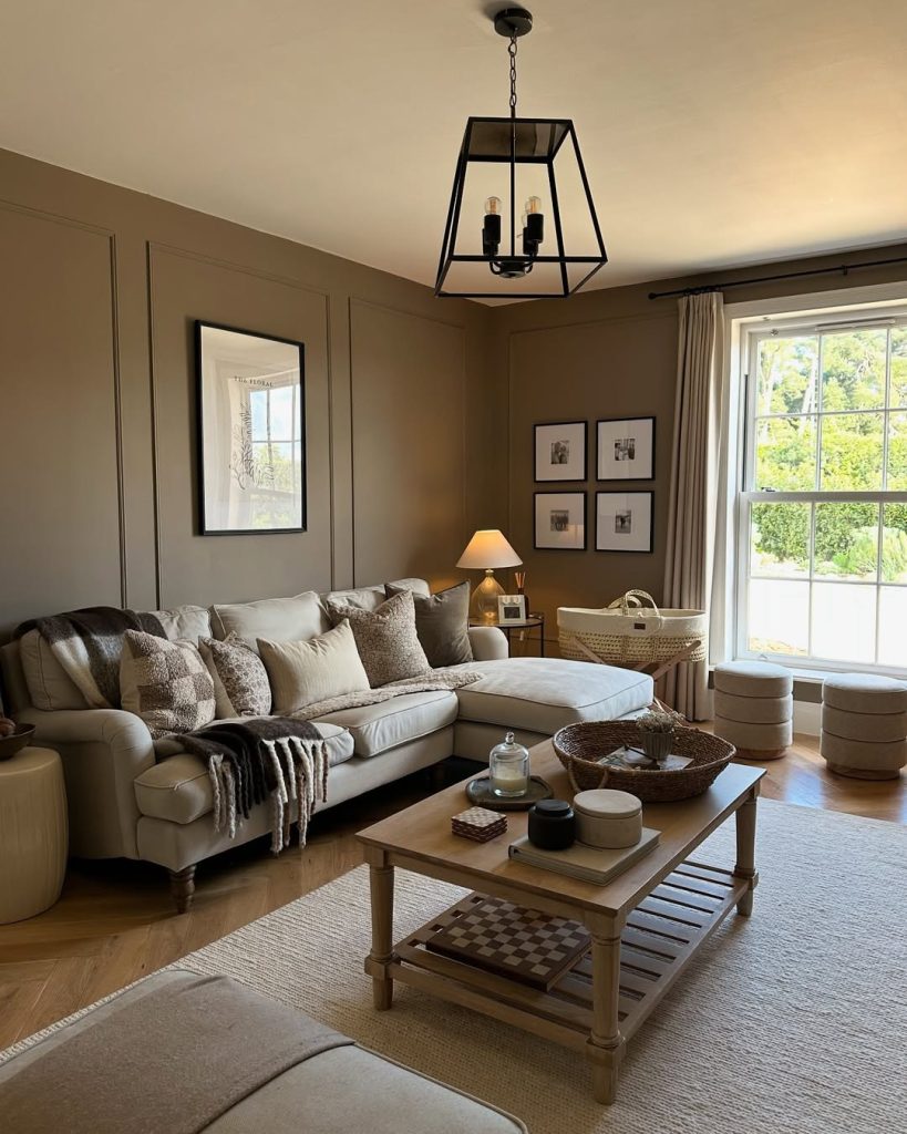 This classic living room captures the enduring appeal of warm and cozy design. Paneled mocha walls create depth, while soft beige furnishings balance the darker tones. The mix of wood, rattan, and layered textiles makes the space feel timeless yet current—perfect for small spaces that need warmth without clutter. A structured black chandelier and curated wall art add subtle elegant contrast, while the natural light brings a feeling of openness. This look blends traditional craftsmanship with modern luxury, proving that comfort and sophistication can beautifully coexist in 2026 trends.