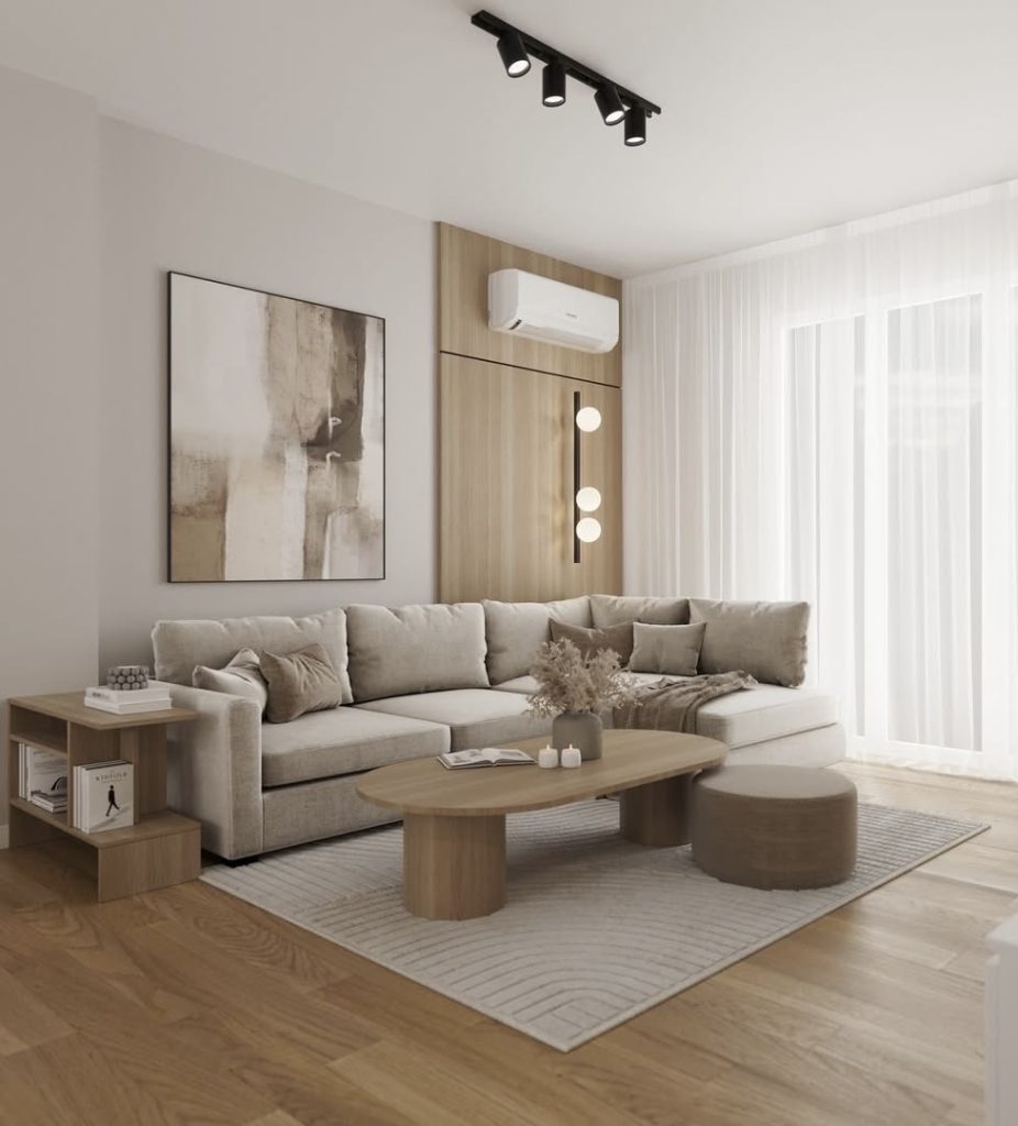 A shining example of Japandi simplicity, this design balances natural wood, soft fabrics, and sculptural shapes. The palette—cream, beige, and pale oak—creates an airy, minimalist aesthetic enhanced by strategic lighting. Every element has a purpose: a low sofa, a rounded table, and abstract art create a cohesive composition that is modern luxury 2026. This room shows that small spaces can be expansive through tonal cohesion and considerate materials. Borrowing from Scandinavian serenity and classic Indian equilibrium, this room makes minimalism a comforting everyday ritual.
