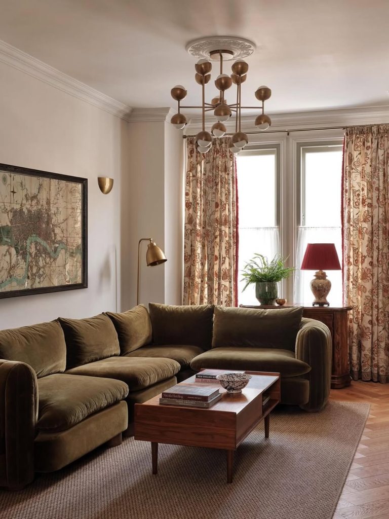 Luxe fabrics and subtle gold details inject 2026 luxury into this retro-style living room. The olive-green velvet sofa, dramatic light fixture, and print curtains evoke old-world elegance that is deep rather than shallow. Brass elements and warm wood add to the cozy ambiance so that it becomes an ideal evening retreat. Specialists at House & Garden point to such layering as one of 2026’s most powerful trends—mixing timeless texture with 2026 functionality. It’s a style that respects heritage while never feeling stale.