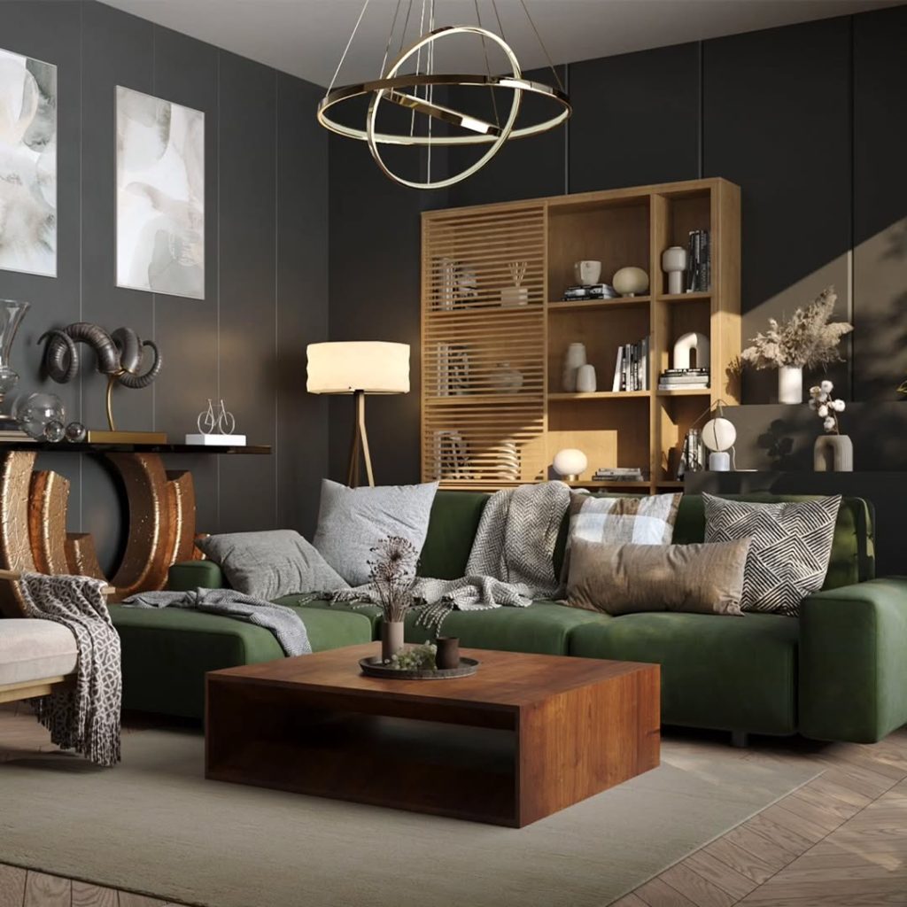 This dramatic composition is the epitome of 2026 modern luxury. Forest-green deep upholstery is paired with rich wood details and sophisticated black walls for a space that is warm as well as authoritative. The gold chandelier and minimal art reinforce the sophisticated mood, while natural light gently blunts its edges. Ideal in open lofts or chic small spaces, this 2026 interior is quintessentially you—it’s nature-based, texturally rich, and emotionally comforting. It’s a dramatic cinematic approach that is livable as well as dramatic—uniting minimalistic design with dramatic atmosphere.