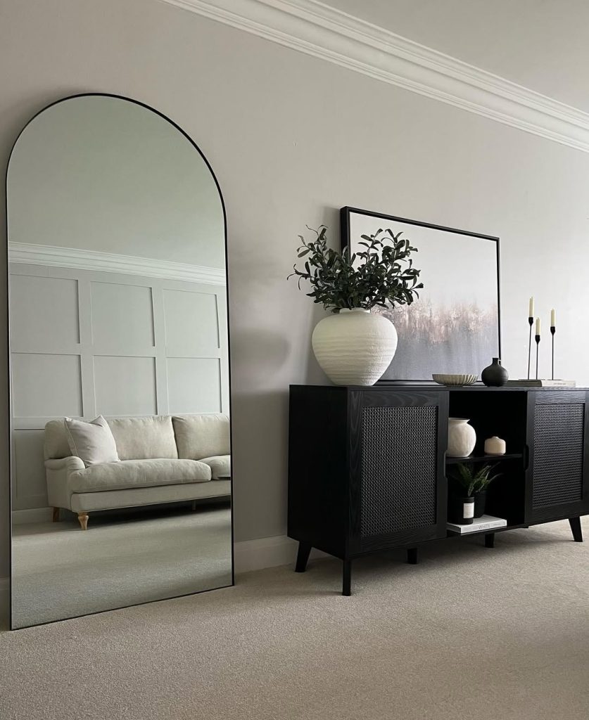 An impressive illustration of minimalist sophistication, this design employs contrast to build on simplicity. The oversized arched mirror opens up the space visually, whereas the black sideboard stabilizes the room with modern luxury. Sculptural pottery pieces and plants inject a gentle organic element, connecting modern refinement with natural equilibrium. This configuration beautifully represents 2026’s latest inclination toward subtle drama—spaces that breathe where everything is intentionally selected. The interplay of texture and shape is strategic for subtle, sophisticated confidence in small volumes.