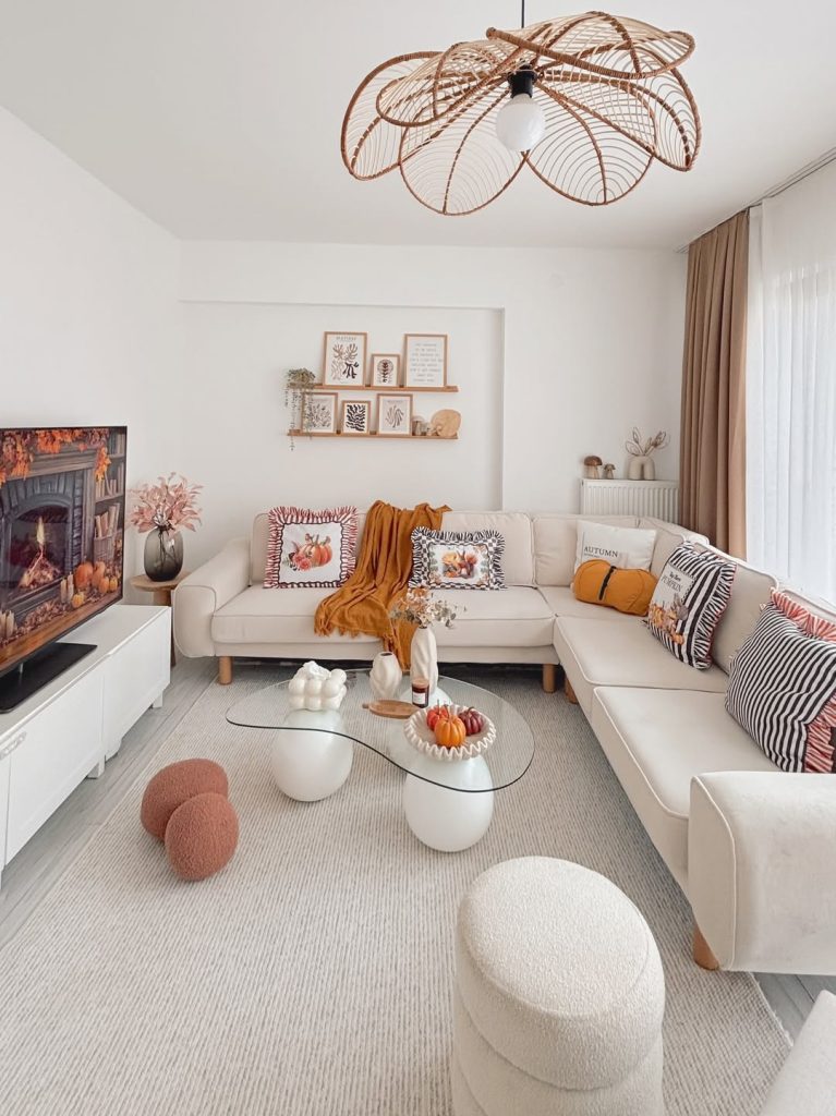 This design is proof that cozy warm living doesn’t mean you have to sacrifice modern clarity. Soft ivory seating, caramel throws, and pumpkin-toned accents create a comforting yet fresh palette. The room’s glass coffee table and natural materials reflect Japandi influences, where minimalist function meets warmth. Subtle decor touches—like abstract art and fall-inspired pillows—bring seasonal character without clutter. This modern luxury 2026 approach celebrates living spaces that evolve naturally with the rhythm of home life.