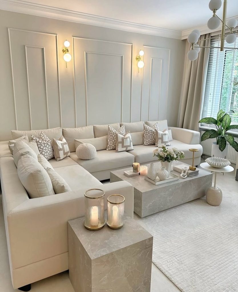 This living room showcases the latest in minimal and modern luxury design with its all-white palette. The spacious sectional sofa, adorned with geometric patterned pillows, creates a crisp yet inviting seating area. Clean-lined marble coffee tables and glowing candles add layers of elegance while keeping the decor understated. Soft wall paneling and globe lighting introduce subtle texture, balancing minimalism with warmth. This serene space embodies the essence of modern luxury in 2026, showing that less can truly feel like more.