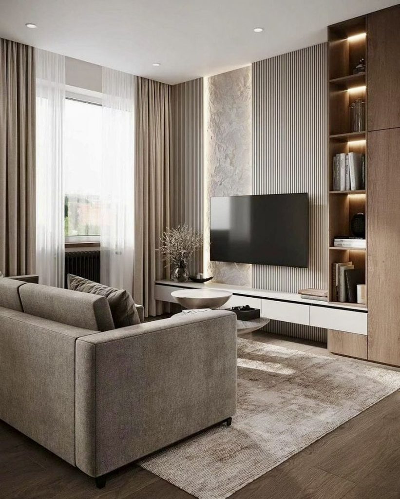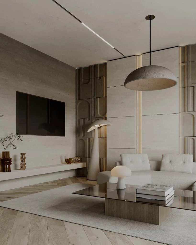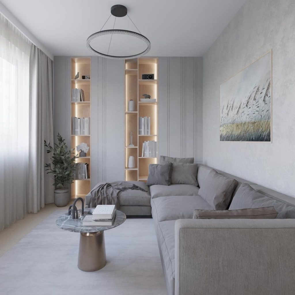 This design highlights minimalist elegance with a muted palette centered on a grey couch and textured walls. Vertical built-in shelves with warm backlighting add both function and visual depth, making the space ideal for small spaces. A circular pendant light and marble-topped table introduce subtle sophistication without overwhelming the calm vibe. Soft textiles and layered cushions create a cozy mood that balances clean geometry. It’s a clear reflection of modern luxury in 2026, proving that less can feel incredibly refined.