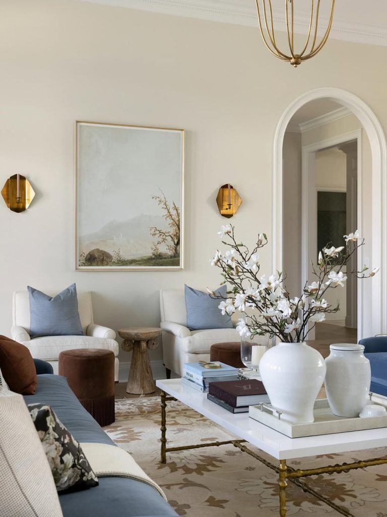 Blending contemporary luxury with subtle classicism, this living room feels sophisticated yet approachable. Neutral armchairs and a plush sofa are accented with soft blue pillows and rich brown ottomans, adding both contrast and comfort. A large framed artwork and sculptural vases bring artistic expression, aligning with 2026 trends for personalized decor. The arched doorway enhances the elegant flow of the room, while a patterned rug adds warmth underfoot. This is the kind of design that feels equally suited to a magazine cover and a cozy family evening.