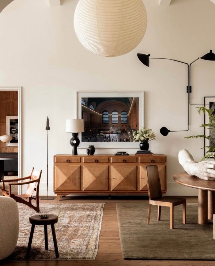 Here, natural wood tones dominate the room, showcasing a classic mid-century aesthetic infused with contemporary details. The geometric credenza, leather armchair, and layered rugs give the room a tactile richness that feels warm and cozy. Large statement lighting and modern wall fixtures blend functionality with bold design. This space shows how 2026 trends lean into authenticity by mixing vintage textures with modern touches. It’s an inspiring setup for those seeking decor that feels timeless yet forward-looking.