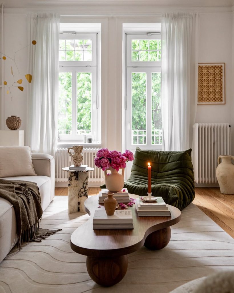 This design blends contemporary luxury with a playful, colorful approach that stands out. The unique coffee table, lush greenery outside the window, and pops of pink flowers bring life and character into the room. A sculptural green lounge chair and soft neutral sofa balance comfort with bold personality. Light streaming through sheer curtains enhances the warm and cozy atmosphere, perfect for relaxing or entertaining. It’s a reminder that modern living rooms can embrace artful vibrancy without losing elegance.