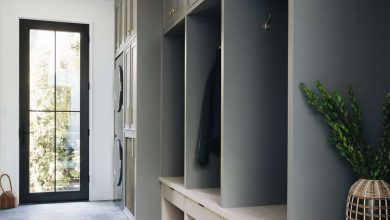 This hallway features a playful contrast between cool blue and vibrant yellow accents, embodying a trend that could be at the forefront of 2025’s color predictions. The blue door, possibly a Benjamin Moore shade, is both bold and soothing, while the yellow coat rack adds a cheerful pop of color. This design approach is excellent for those looking to inject a bit of personality into their space without overwhelming it. The colorful accents brighten the area and make it more engaging and memorable.