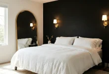 Let’s embrace the understated elegance found in a hallway that marries minimalism with warmth. A large, round mirror anchors the space, set against a backdrop of soft white walls and a bold, black mantel. The symmetry between the mirror and the console table below creates a serene balance, enhanced by the organic textures of the woven basket and ceramic vase. It’s a space that speaks to the neutral, cream hues favored by many for their calming effect, making it a versatile choice for a variety of homes, from small front entrances to long halls in luxury abodes.