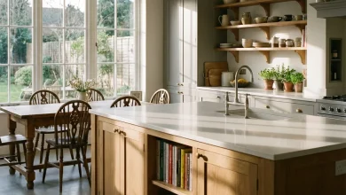 This kitchen captures the essence of a rustic yet refined aesthetic. The deep, farmhouse-style sink is perfectly integrated into a serene palette of muted greens and natural woods. The brass fixtures add a touch of antiquity, while the open shelving and hanging pots are a nod to practicality and ease of access. This is a space where the modern merges with the nostalgic, creating a warm, inviting atmosphere.