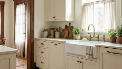 The epitome of rustic elegance, this kitchen presents a spacious farmhouse sink paired with marble countertops and vintage brass fixtures. Set against cabinetry painted in a soothing hue, this space strikes a perfect balance between large, open design and intimate, small spaces charm. It’s a setting that’s as welcoming as it is functional, with every element thoughtfully curated to create a cohesive whole.