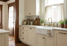 Monochromatic doesn’t have to mean monotonous. This kitchen proves it with a large sink area that blends seamlessly into the classic design. With cabinetry that whispers understated luxury and a sink that provides ample space for kitchen tasks, this setup is a nod to the modern farmhouse trend, blending traditional and contemporary elements with grace.